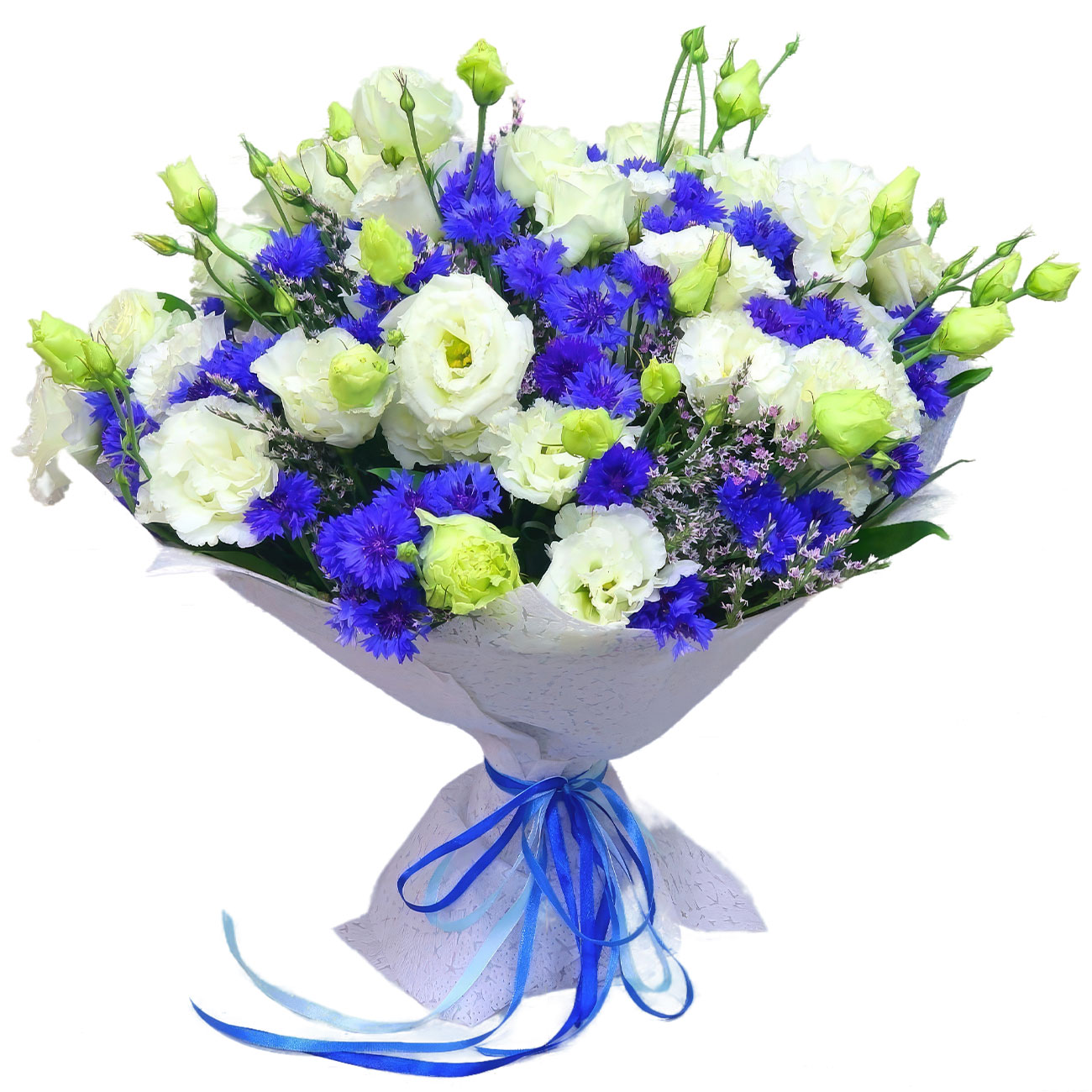 Васильки, эустома белая, зелень. Упаковка (лента, пленка, крафт, сетка, пленка матовая)