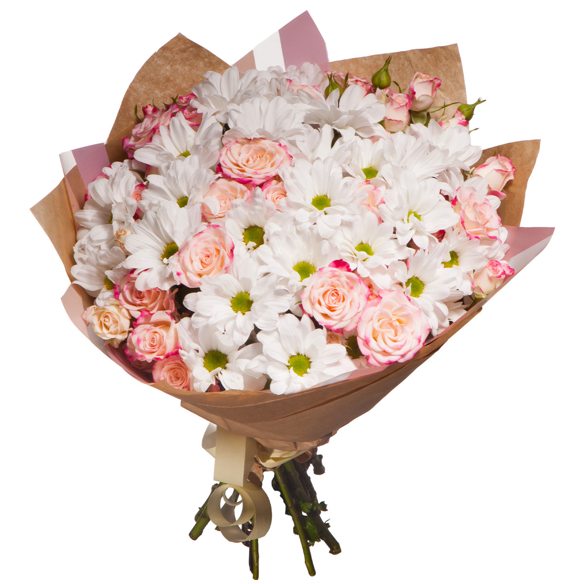 Хризантема кустовая белая, роза кустовая розовая. Упаковка (лента, пленка, крафт, сетка, пленка матовая)
