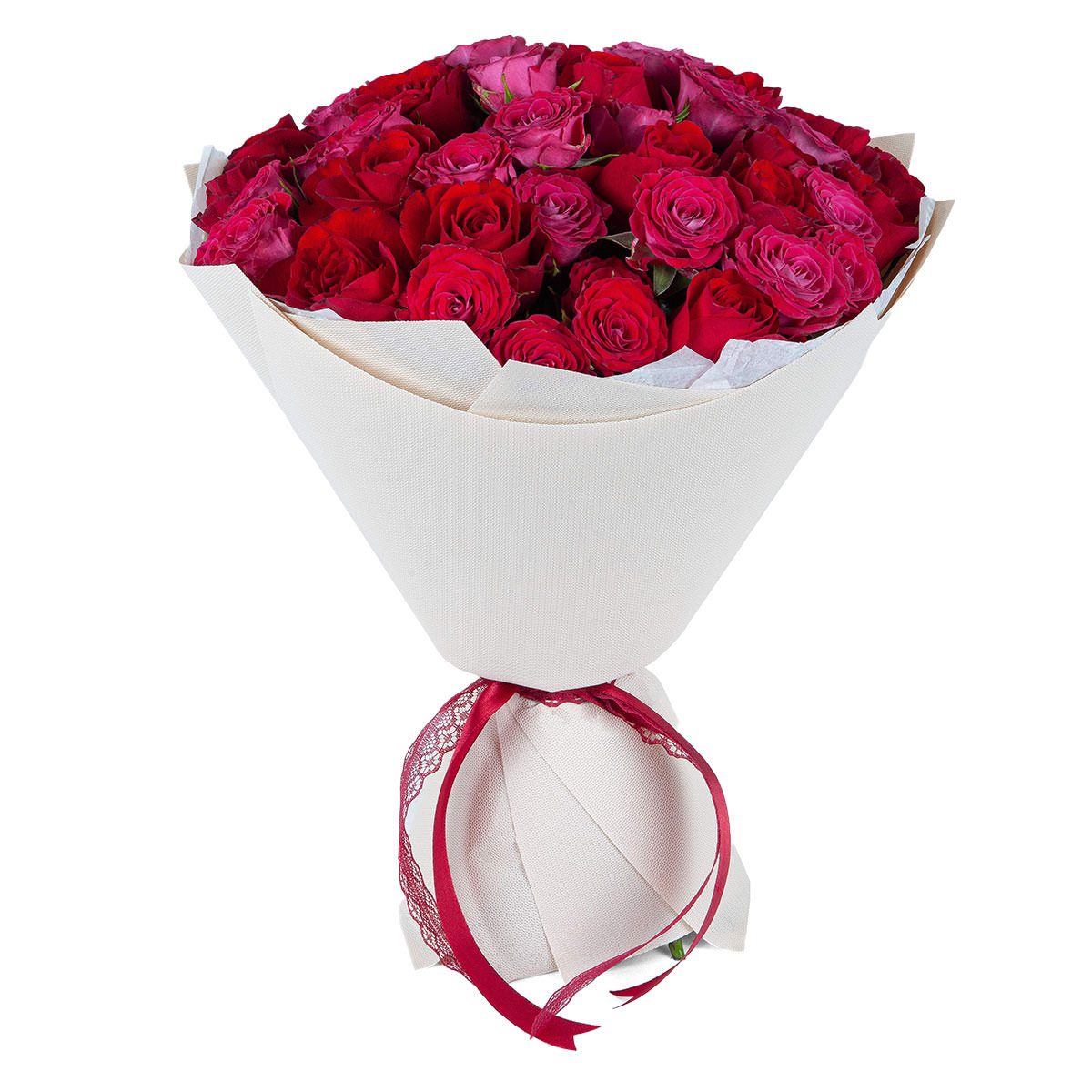 Роза одноголовая красно-розовая. Упаковка (лента, пленка, крафт, сетка, пленка матовая)