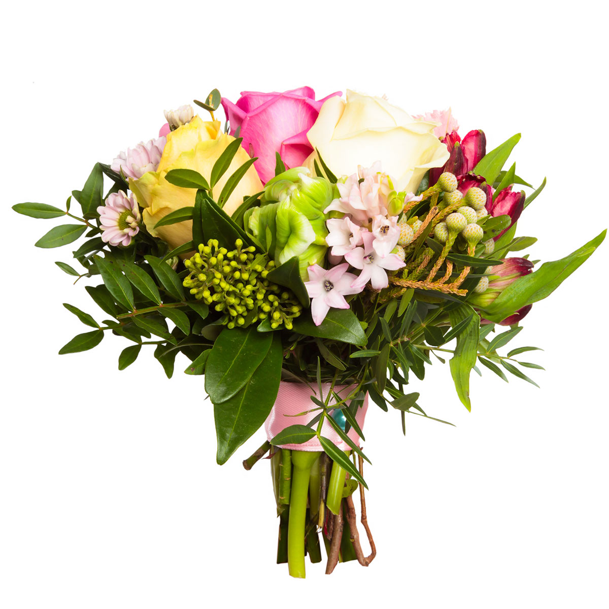 Роза одноголовая белая, розовая, желтая, хризантема розовая, волчеягодник, скимия, бруния, львиный зев, зелень. Упаковка (лента, пленка, крафт, сетка, пленка матовая)