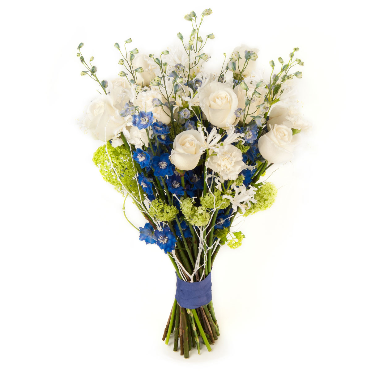Роза одноголовая белая, живокость, гортензия зеленая, зелень. Упаковка (лента, пленка, крафт, сетка, пленка матовая)