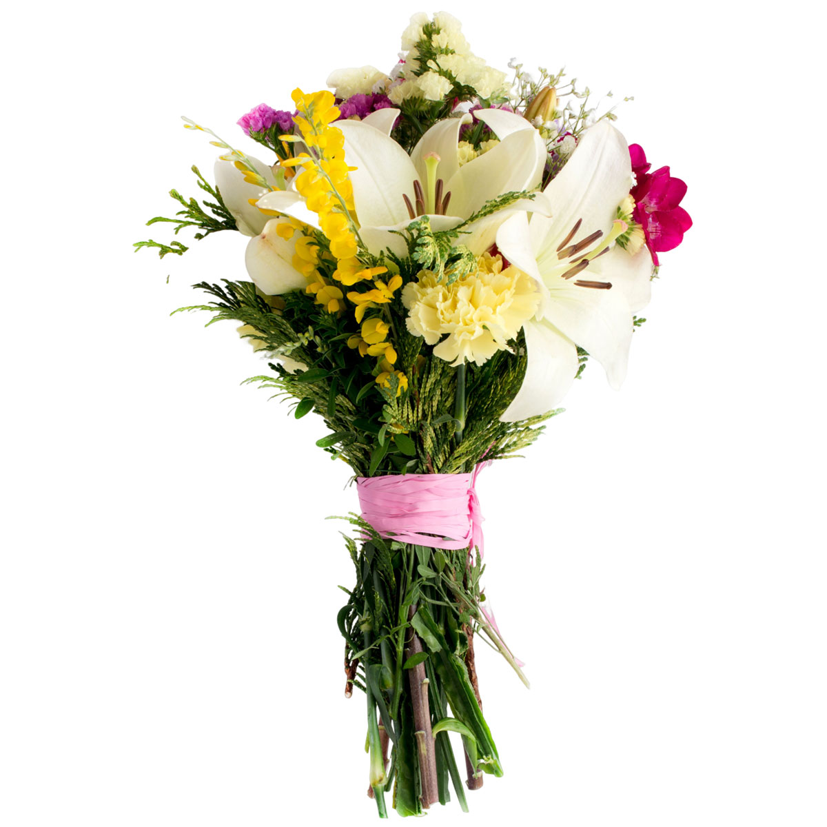 Лилия белая, гвоздиа белая, фрезия розовая, статица сиреневая и белая, львиный зев желтый, туя, гипсофила. Упаковка (лента, пленка, крафт, сетка, пленка матовая)