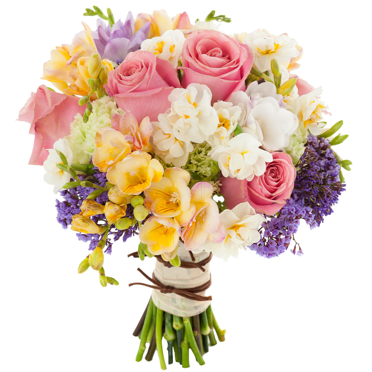 Роза одноголовая розовая, фрезия желтая и сиреневая, гвоздика, маттиола белая, сухоцвет. Упаковка (лента, пленка, крафт, сетка, пленка матовая)