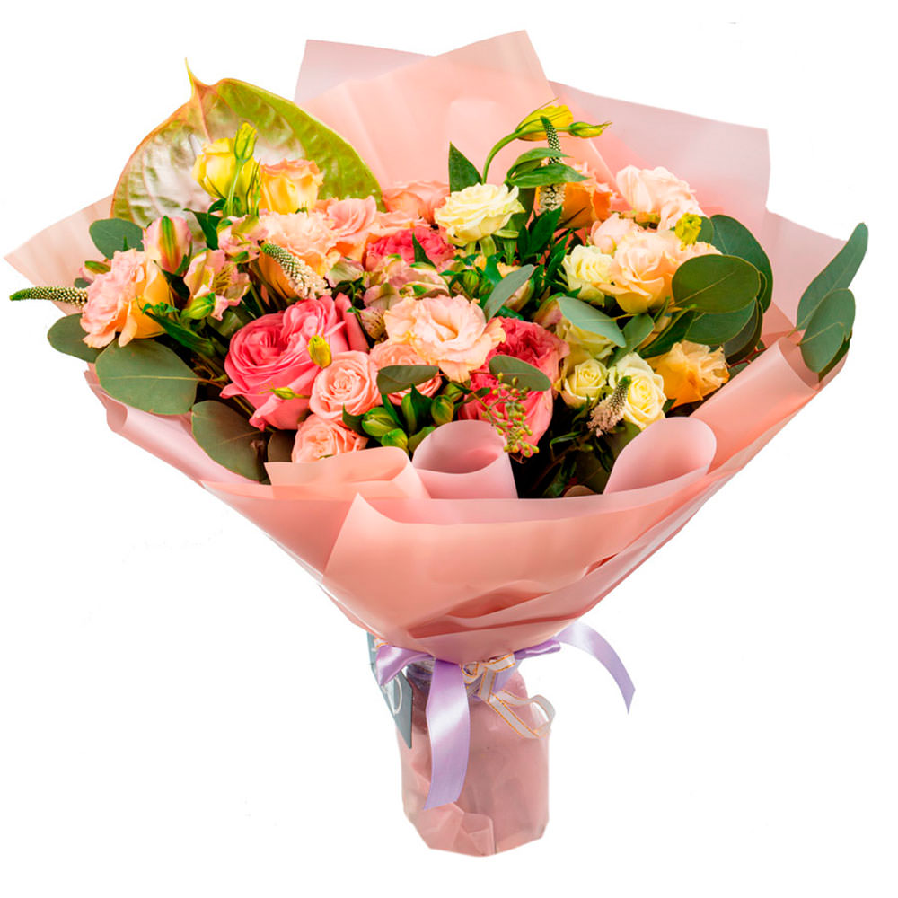 Роза одноголовая розовая, эустома розовая, роза кустовая кремовая, эвкалипт, вероника, экзотическая зелень, эвкалипт. Упаковка (лента, пленка, крафт, сетка, пленка матовая)