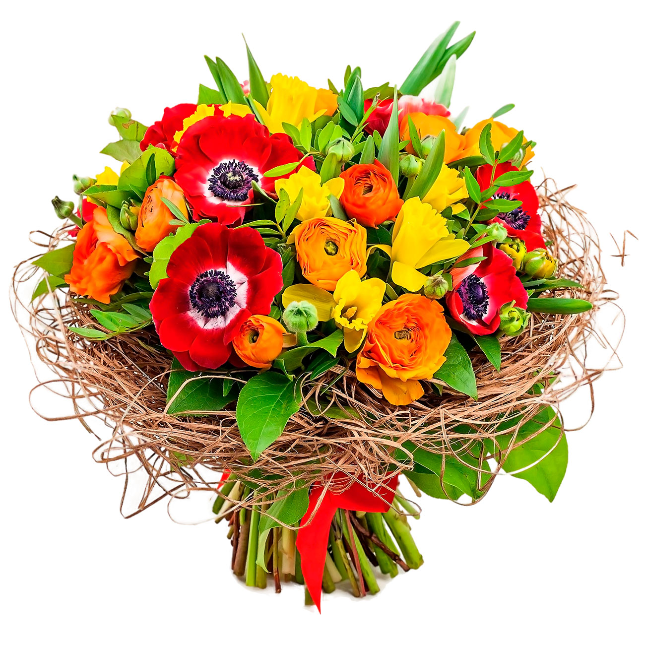 Мак красный, нарцисс желтый, ранункулюс мини оранжевый, салал, фисташка. Упаковка (лента, пленка, крафт, сетка, пленка матовая)