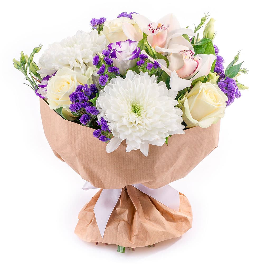 Хризантема одноголовая белая, роза одноголовая белая, орхидея белая, статица. Упаковка (лента, пленка, крафт, сетка, пленка матовая)