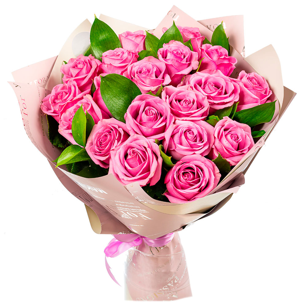 Роза одноголовая розовая, зелень. Упаковка (лента, пленка, крафт, сетка, пленка матовая)