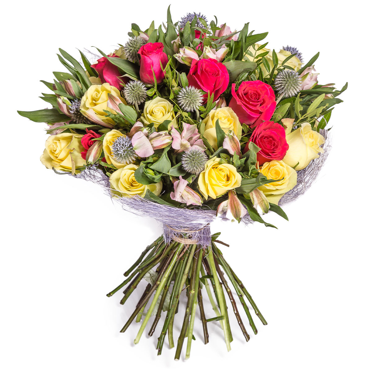Роза одноголовая розовая и желтая, альстромерия розовая, эрингиум. Упаковка (лента, пленка, крафт, сетка, пленка матовая)