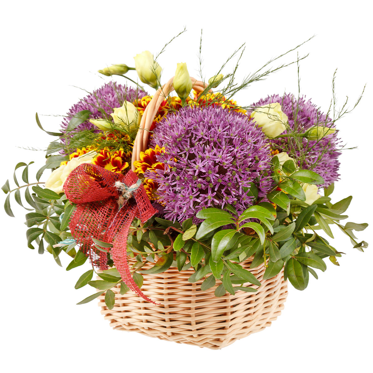 Аллиум, эустома белая, хризантема кустовая желто-красная, зелень. Упаковка (Корзина, оазис, ящик).