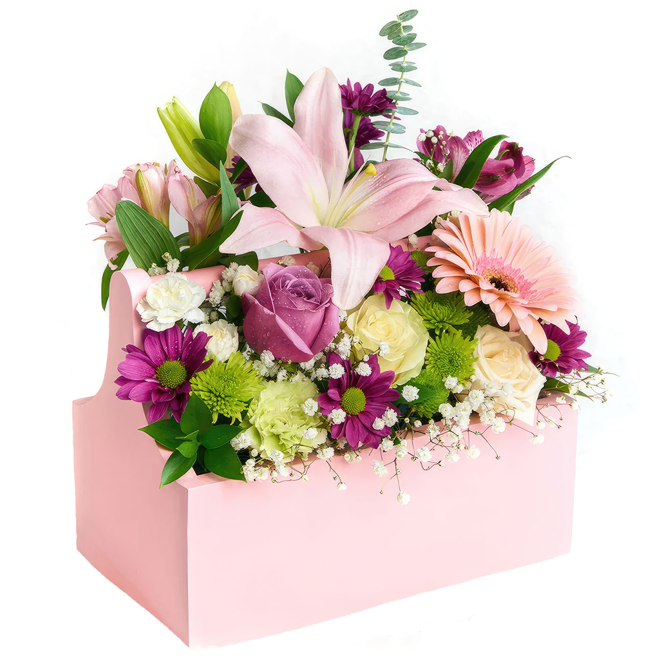 Лилия розовая, гербера розовая, хризантема кустовая зеленая и сиреневая, роза одноголовая сиреневая и белая, диантус белый, альстромерия сиреневая, гипсофила, эвкалипт. Упаковка (Корзина, оазис, ящик).