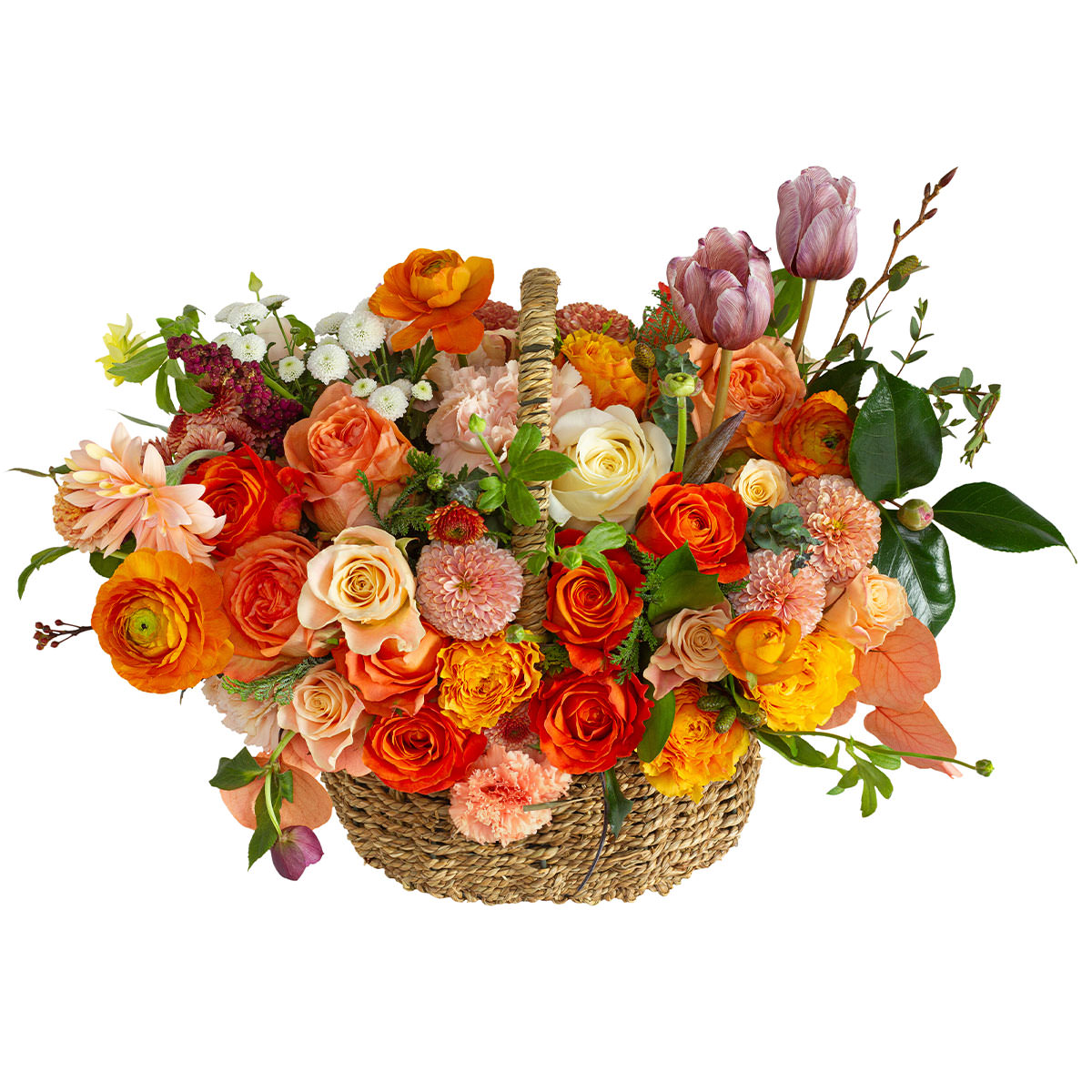 Роза одноголовая разных цветов, ранункулюс оранжевый, гвоздика розовая, хризантема кустовая мини белая, тюльпан сиреневый, Цинния Салмон Роуз. Упаковка (Корзина, оазис, ящик).