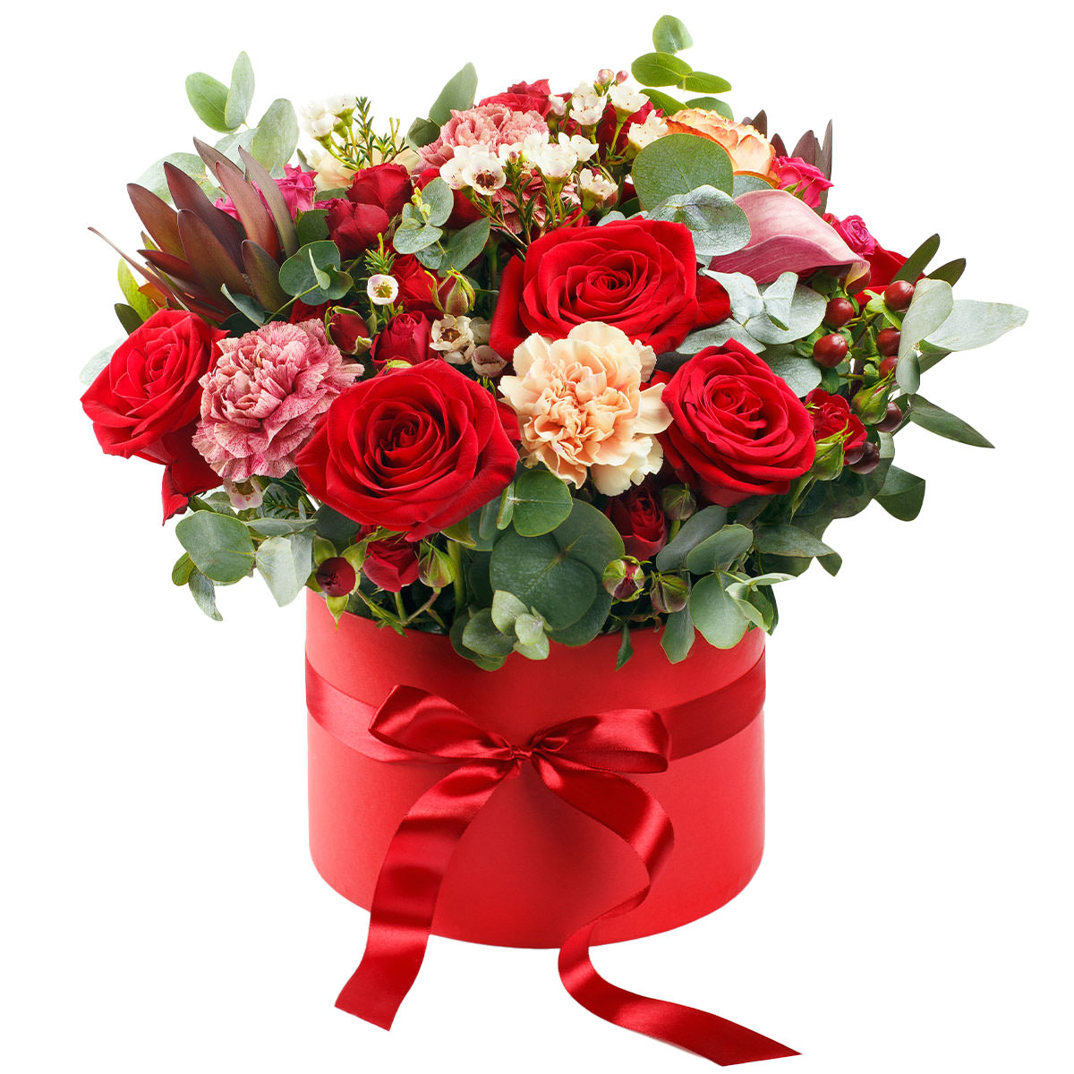 Роза одноголовая красная, роза кустовая красная, гвоздика розовая и кремовая, протея, ваксфлауэр, гиперикум, эвкалипт. Упаковка (шляпная коробка, квадратный бокс, коробка сердце, оазис)