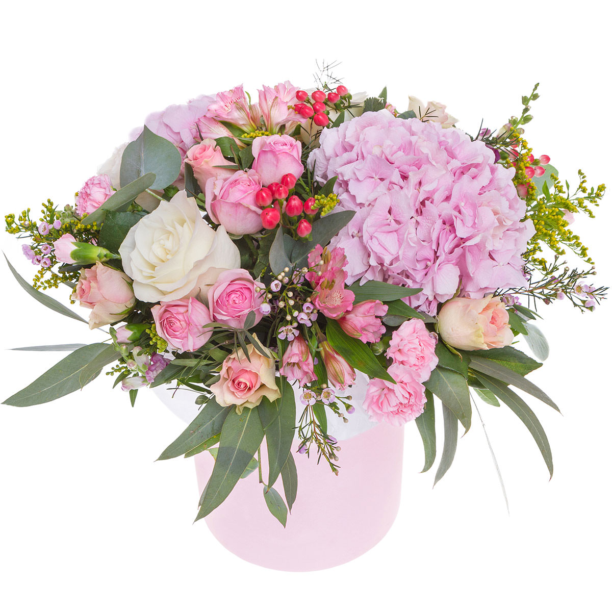 Гортензия розовая, роза кустовая розовая, роза одноголовая белая, альстромерия розовая, гвоздика кустовая мини розовая, ваксфлауэр, гиперикум, солидаго, эвкалипт. Упаковка (шляпная коробка, квадратный бокс, коробка сердце, оазис)