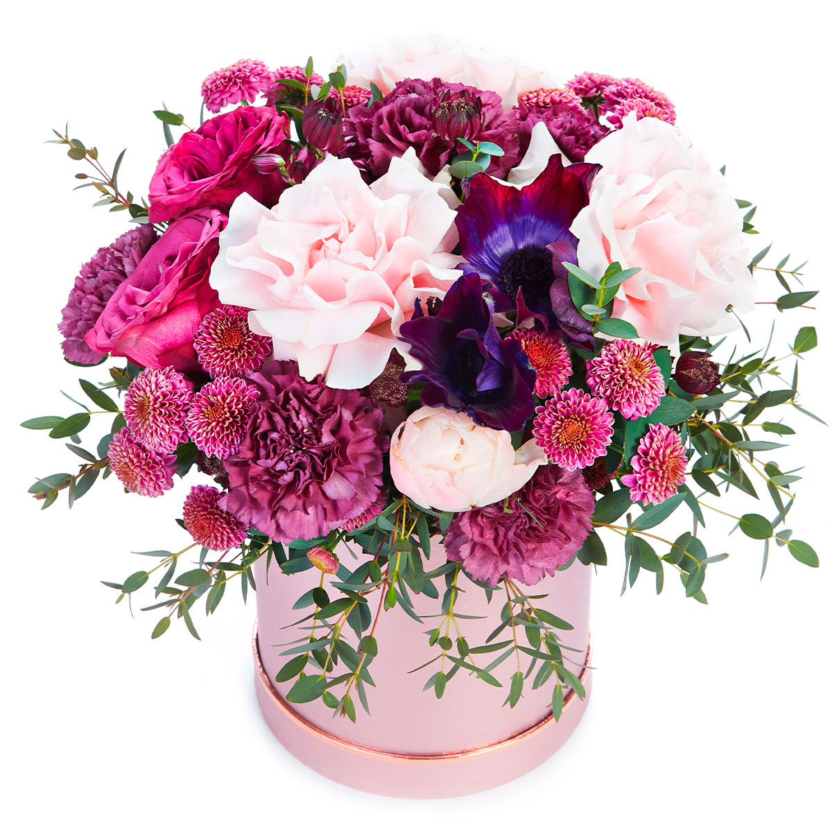 Роза одноголовая розовая, гвоздика сиреневая, анемон бордо, хризантема кустовая розовая, эвкалипт. Упаковка (шляпная коробка, квадратный бокс, коробка сердце, оазис)