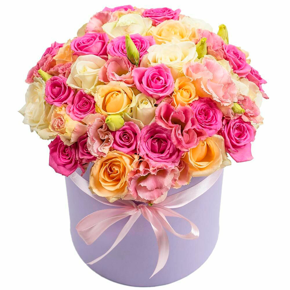 Роза одноголовая микс (кремовая, желтая, розовая), эустома розовая. Упаковка (шляпная коробка, квадратный бокс, коробка сердце, оазис)