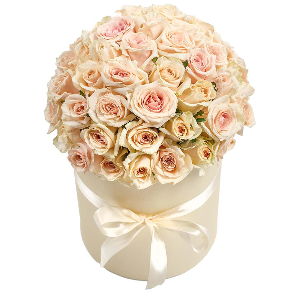 Роза Россия одноголовая кремовая. Упаковка (шляпная коробка, квадратный бокс, коробка сердце, оазис)