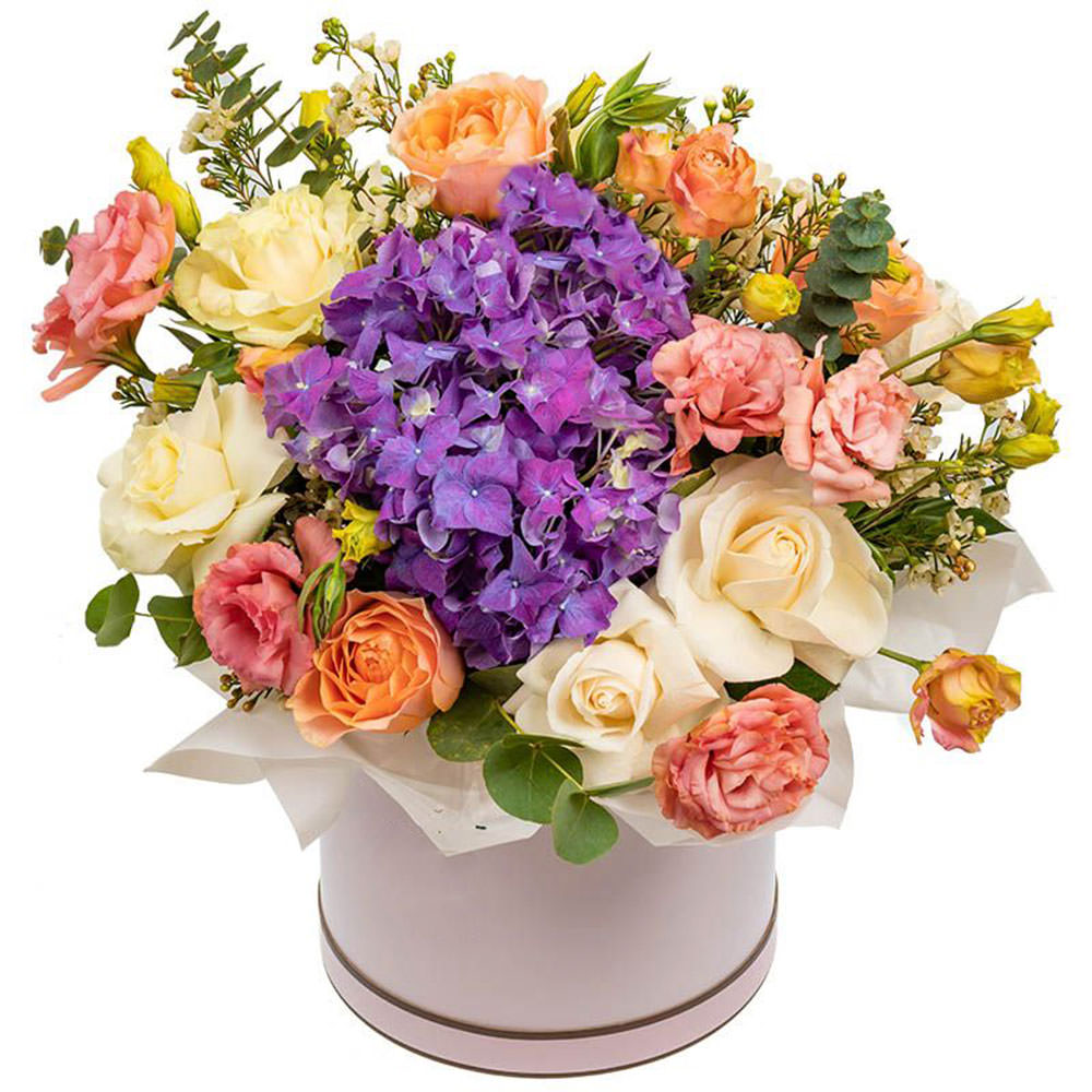 Гортензия фиолетовая, роза одноголовая белая, роза пионовидная кустовая персиковая, эустома пудровая, зелень. Упаковка (шляпная коробка, квадратный бокс, коробка сердце, оазис)