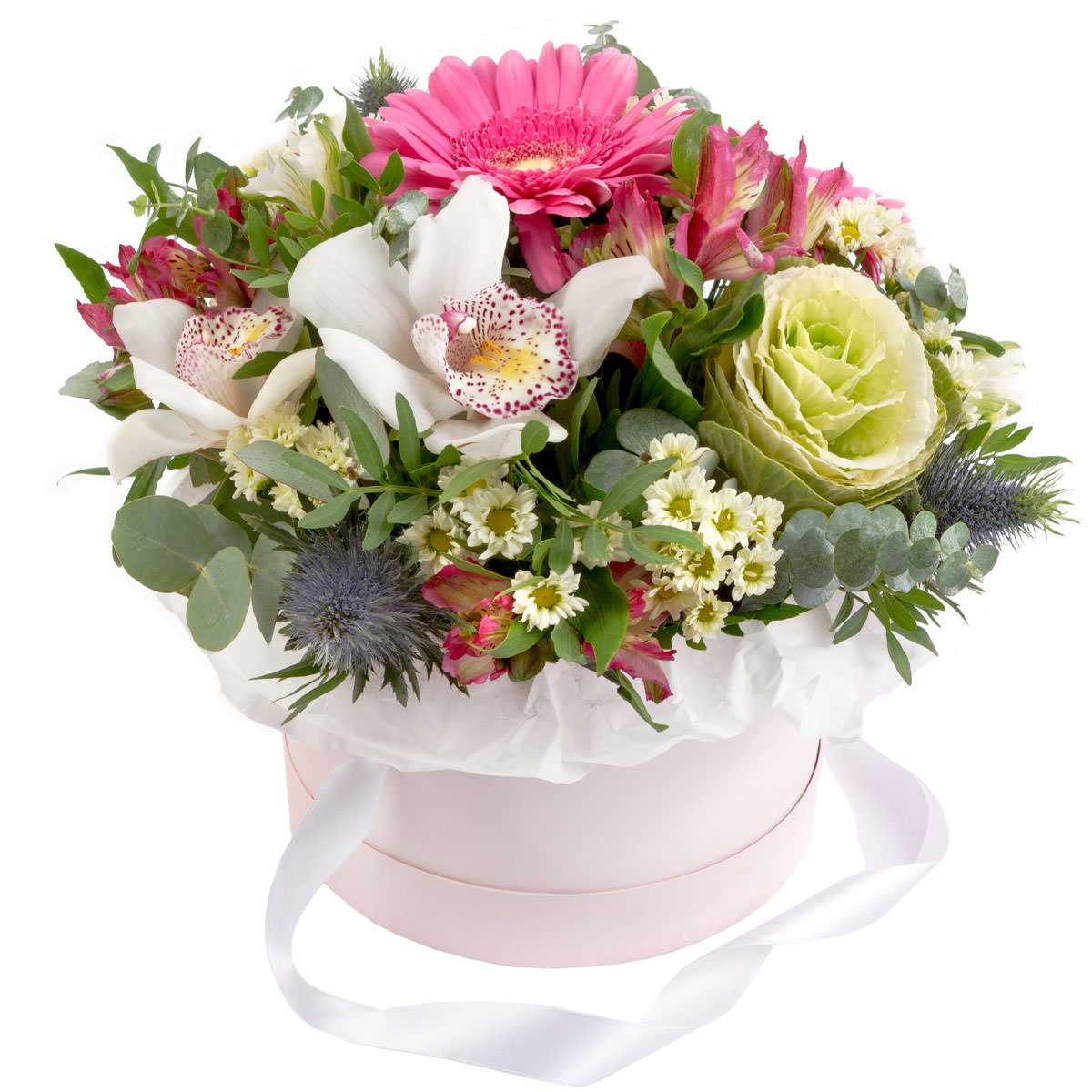 Орхидея белая, гербера розовая, капуста декоративная, хризантема кустовая мини белая, альстромерия розовая, эрингиум, эвкалипт. Упаковка (шляпная коробка, квадратный бокс, коробка сердце, оазис)