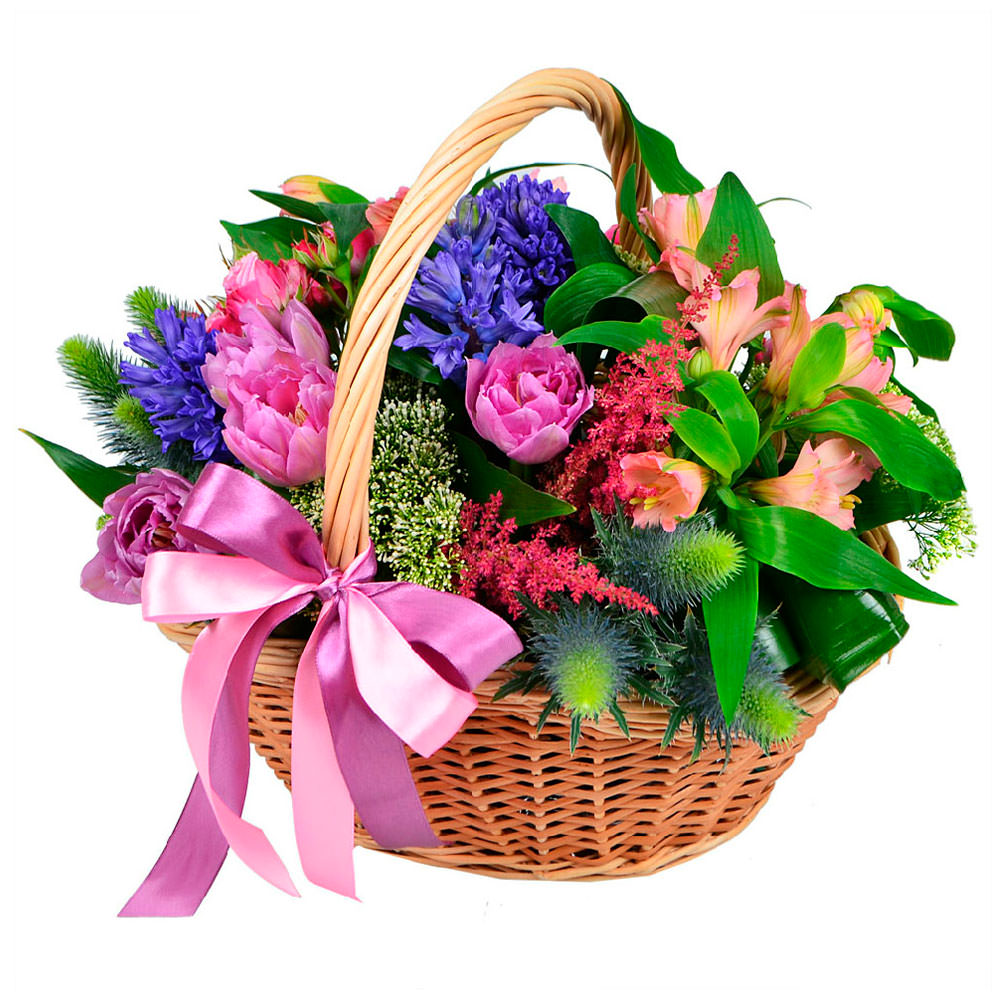 Тюльпан розовый, гиацинт, астильба, эрингиум, альстромерия персиковая, трахелиум, бруния, аспидистра. Упаковка (Корзина, оазис).